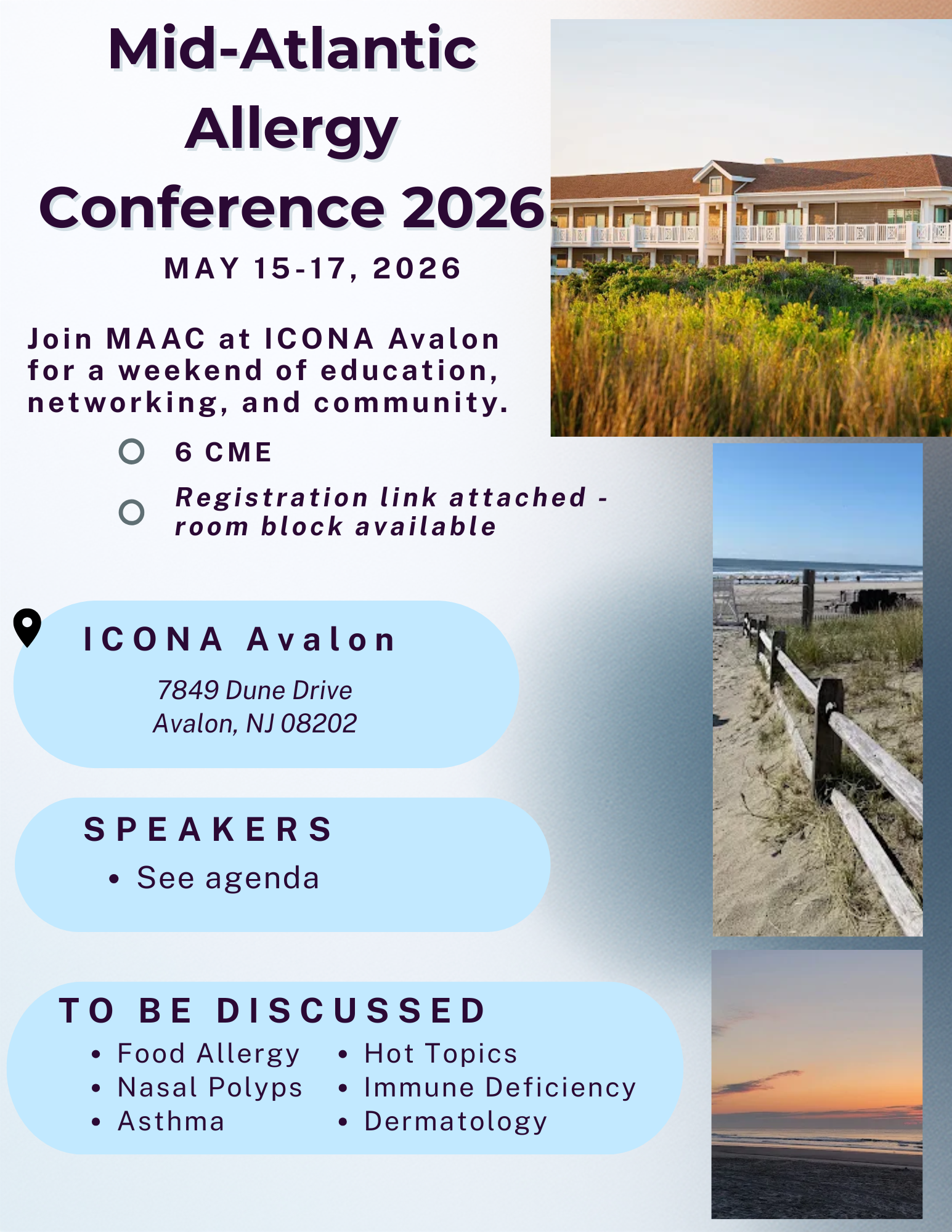 The Mid-Atlantic Allergy Conference (MAAC) is a non-profit organization that helps promote networking, education, camaraderie, and support of the patient-physician relationship. As a collective of private practice allergists (from CAA, PAA, STIA & other allergy societies) we gather to help advance the practice of medicine forward. As solo and small practice allergists, we each have survived through challenging times in medicine but as a collective, we strive to provide our patients with the best allergy care.